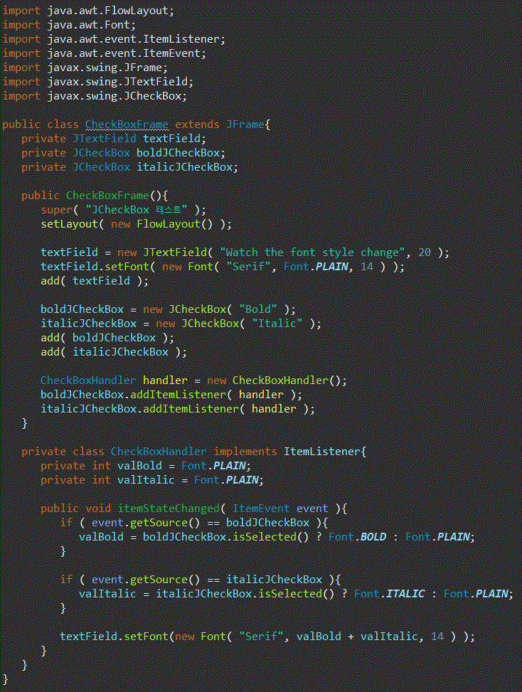 JCheckBox(옵션 다중 선택)JAVA/GUI - Swing 2020. 10. 24. 20:11