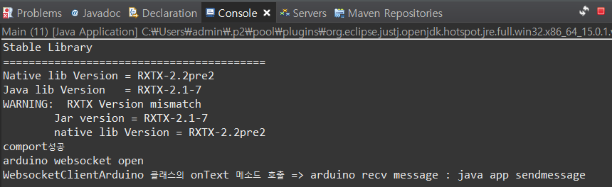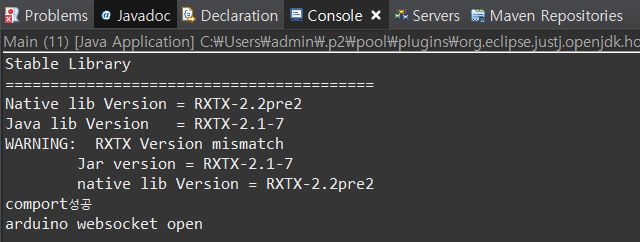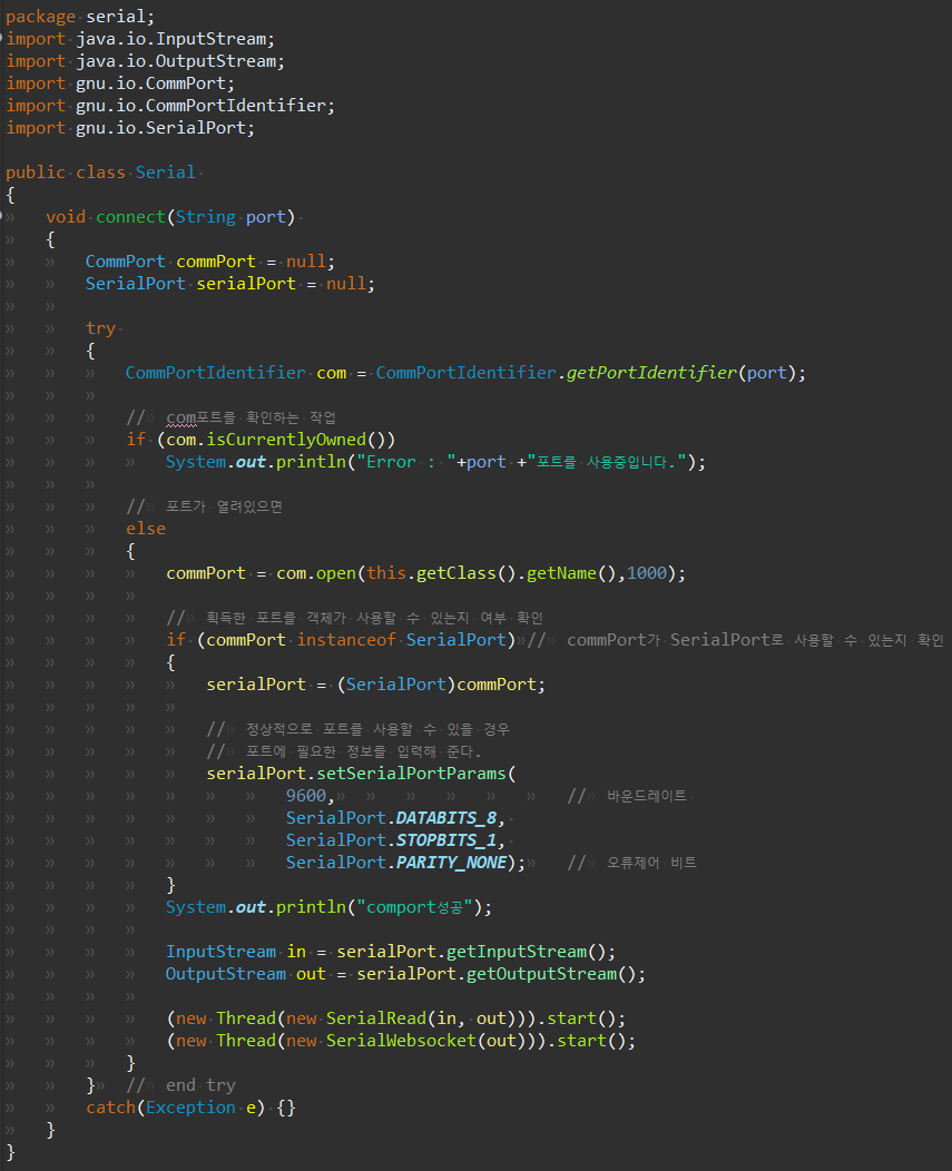 더보기package serial; import java.io.InputStream; import java.io.OutputStream; import gnu.io.CommPort; import gnu.io.CommPortIdentifier; import gnu.io.SerialPort; public class Serial { void connect(String port) { CommPort commPort = null; SerialPort serialPort = null; try { CommPortIdentifier com = CommPortIdentifier.getPortIdentifier(port); // com포트를 확인하는 작업 if (com.isCurrentlyOwned()) System.out.println("Error : "+port +"포트를 사용중입니다."); // 포트가 열려있으면 else { commPort = com.open(this.getClass().getName(),1000); // 획득한 포트를 객체가 사용할 수 있는지 여부 확인 if (commPort instanceof SerialPort) // commPort가 SerialPort로 사용할 수 있는지 확인 { serialPort = (SerialPort)commPort; // 정상적으로 포트를 사용할 수 있을 경우 // 포트에 필요한 정보를 입력해 준다. serialPort.setSerialPortParams( 9600, // 바운드레이트 SerialPort.DATABITS_8, SerialPort.STOPBITS_1, SerialPort.PARITY_NONE); // 오류제어 비트 } System.out.println("comport성공"); InputStream in = serialPort.getInputStream(); OutputStream out = serialPort.getOutputStream(); (new Thread(new SerialRead(in, out))).start(); (new Thread(new SerialWebsocket(out))).start(); } } // end try catch(Exception e) {} } }SerialRead.java