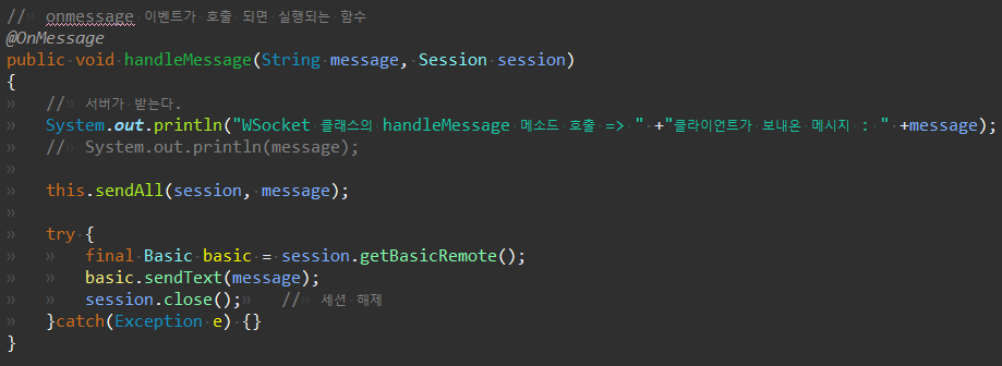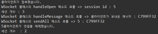 아래의 handleMessage 메소드에서 데이터를 뿌리고 나서, 해당 세션의 연결을 해제한다.