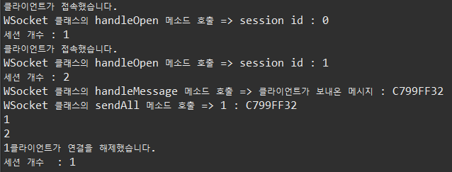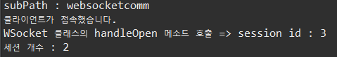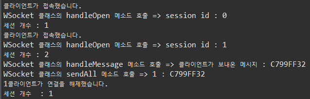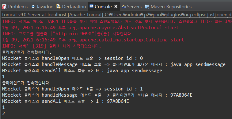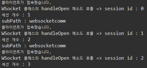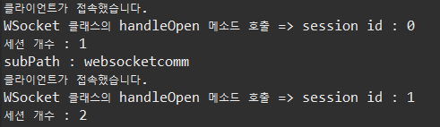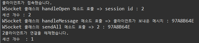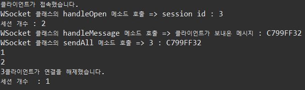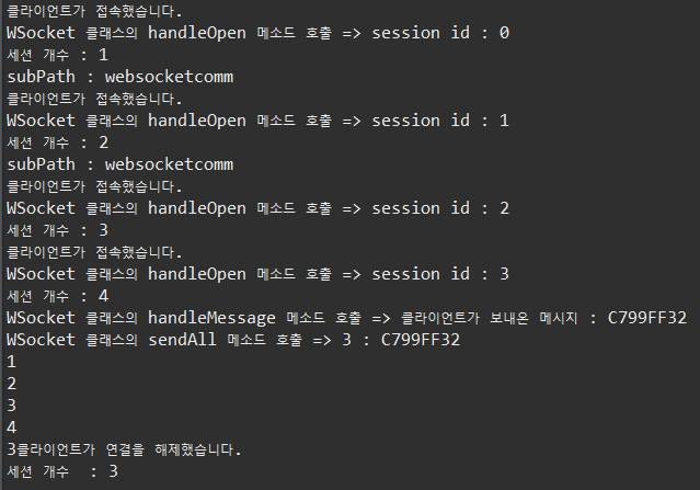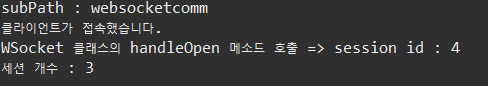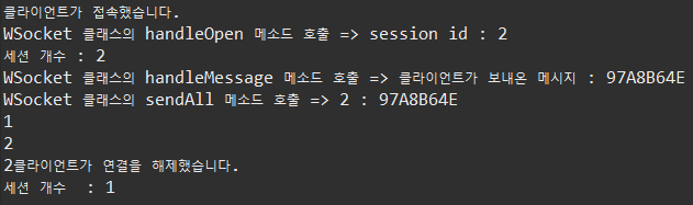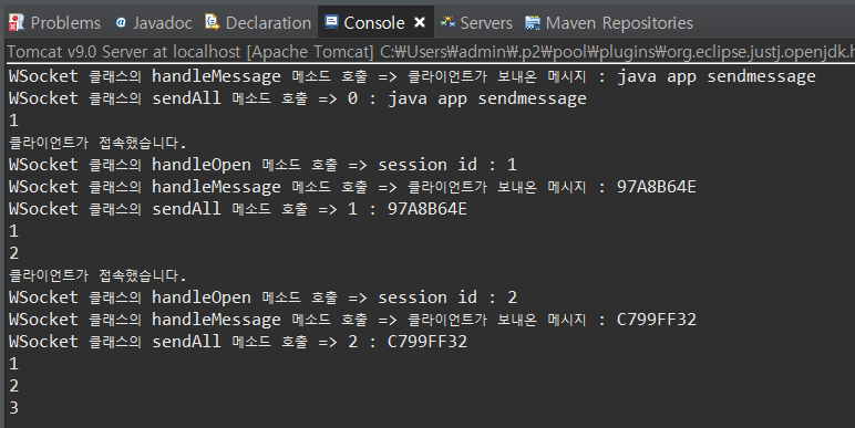 더보기package websocket; import java.util.Collections; import java.util.Set; import javax.websocket.OnClose; import javax.websocket.OnError; import javax.websocket.OnMessage; import javax.websocket.OnOpen; import javax.websocket.RemoteEndpoint.Basic; import javax.websocket.Session; import javax.websocket.server.ServerEndpoint; @ServerEndpoint("/websocket") public class WSocket { private static final Set<Session> sessions = Collections.synchronizedSet( new java.util.HashSet<Session>() ); // onopen 이벤트가 호출 되면 실행되는 함수 @OnOpen public void handleOpen(Session session) { System.out.println("클라이언트가 접속했습니다."); System.out.println("WSocket 클래스의 handleOpen 메소드 호출 => " +"session id : " +session.getId()); sessions.add(session); } /* // onclose 이벤트가 호출 되면 실행되는 함수 @OnClose public void handleClose() { System.out.println("클라이언트가 연결을 해제했습니다."); } */ // onclose 이벤트가 호출 되면 실행되는 함수 @OnClose public void handleClose(Session session) { System.out.println(session.getId() + "클라이언트가 연결을 해제했습니다."); // 세션을 닫는다. sessions.remove(session); } // onerror 이벤트가 호출 되면 실행되는 함수 @OnError public void handleError(Throwable t) { t.printStackTrace(); } // onmessage 이벤트가 호출 되면 실행되는 함수 @OnMessage public void handleMessage(String message, Session session) { // 서버가 받는다. System.out.println("WSocket 클래스의 handleMessage 메소드 호출 => " +"클라이언트가 보내온 메시지 : " +message); // System.out.println(message); this.sendAll(session, message); try { final Basic basic = session.getBasicRemote(); basic.sendText(message); }catch(Exception e) {} } public void sendAll(Session session, String message) { System.out.println("WSocket 클래스의 sendAll 메소드 호출 => " + session.getId() + " : " +message); try { int i = 0; // 웹 소켓에 연결되어 있는 모든 아이디를 찾는다. for (Session s : WSocket.sessions) { System.out.println(++i); if (!s.getId().equals(session.getId())) { s.getBasicRemote().sendText(message); } } }catch(Exception e) {e.printStackTrace();} } }아래는 서버를 실행하고 나서, Main.java를 실행했을 때의 콘솔 창의 실행결과이다.