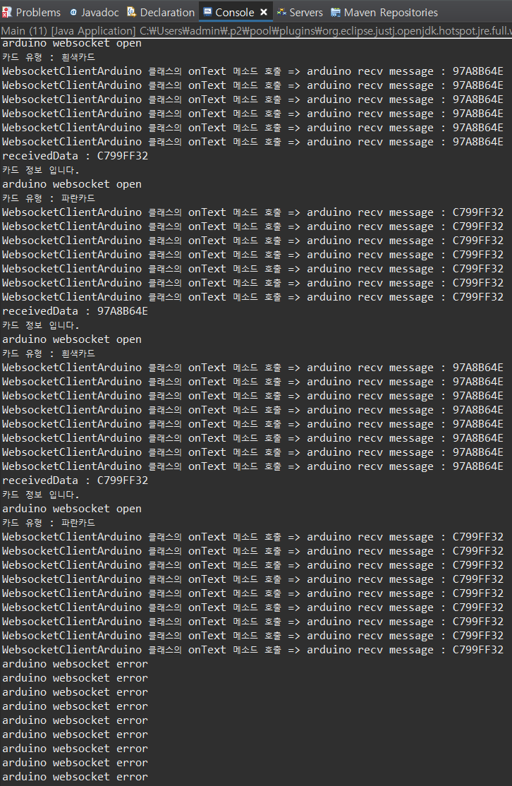 더보기package serial; import java.io.InputStream; import java.io.OutputStream; import java.net.URI; import java.net.http.HttpClient; import java.net.http.WebSocket; import java.util.concurrent.CountDownLatch; public class ProcessRFID { private InputStream in; private OutputStream out; private CountDownLatch latch; private WebSocket ws; // 흰색 카드 파란 카드, public static String[] RFIDs = { "97A8B64E", "C799FF32"}; public ProcessRFID(InputStream in, OutputStream out) { this.in = in; this.out = out; latch = new CountDownLatch(10); // 데이터를 10번만 받겠다는 의미 URI uri = URI.create("ws://localhost:9090/websocket"); // WebsocketClientArduino 클래스의 onText함수가 호출이 된다. WebsocketClientArduino listener = new WebsocketClientArduino( this.latch, this.out ); ws = HttpClient.newHttpClient().newWebSocketBuilder().buildAsync( uri, listener).join(); } // 파란 카드이면 true를, 흰색 카드이면 false를 리턴 public static boolean IsMatchedBlueCard(String receivedData) { if ( RFIDs[0].equals(receivedData) ) return false; else return true; } public static boolean IsMatchedRFID(String receivedData) { boolean ret = false; for ( String s : RFIDs) { if ( s.equals(receivedData)) { ret = true; break; } } return ret; } private String GetCardInfo(String receivedData) { String ret = ""; if (receivedData.equals(RFIDs[0])) ret = "흰색카드"; else if (receivedData.equals(RFIDs[1])) ret = "파란카드"; else ret = "정의되지않음"; return ret; } public void SendReceivedDataToWebSocket(String receivedData) { System.out.println("카드 유형 : " +this.GetCardInfo(receivedData)); ws.sendText(receivedData, true); } }WebsocketClientArduino.java