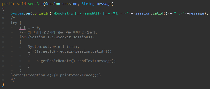 그리고, websocket 패키지의 WSocket.java에서 sendAll 메소드를 보자.