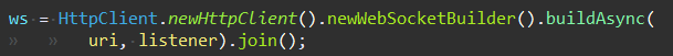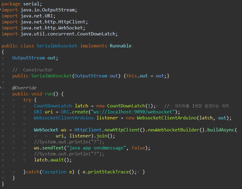 더보기package serial; import java.io.OutputStream; import java.net.URI; import java.net.http.HttpClient; import java.net.http.WebSocket; import java.util.concurrent.CountDownLatch; public class SerialWebsocket implements Runnable { OutputStream out; // Constructor public SerialWebsocket(OutputStream out) {this.out = out;} @Override public void run() { try { CountDownLatch latch = new CountDownLatch(10); // 데이터를 10번만 받겠다는 의미 URI uri = URI.create("ws://localhost:9090/websocket"); WebsocketClientArduino listener = new WebsocketClientArduino(latch, out); WebSocket ws = HttpClient.newHttpClient().newWebSocketBuilder().buildAsync( uri, listener).join(); ws.sendText("java app sendmessage", true); latch.await(); }catch(Exception e) { e.printStackTrace(); } } }websocket패키지의 내용을 보자.