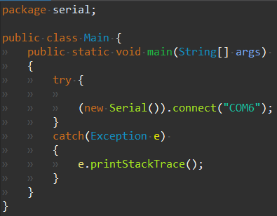 더보기package serial; public class Main { public static void main(String[] args) { try { (new Serial()).connect("COM6"); } catch(Exception e) { e.printStackTrace(); } } }Serial.java