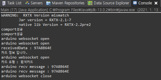 더보기package serial; import java.io.IOException; import java.io.InputStream; import java.io.OutputStream; public class SerialRead implements Runnable { InputStream in; private OutputStream out; boolean dataReceiveOk = false; boolean dataReceiveComplete = false; String receivedData = ""; public SerialRead(InputStream in, OutputStream out) { this.in = in; this.out = out; } @Override public void run() { byte[] buffer = new byte[1024]; int len = -1; try { String s = ""; // buffer에 저장하고나서, 그 길이를 반환한다. while ((len = this.in.read(buffer)) > -1) { s = new String( buffer, 0, len ); if ( s.length() == 0 && this.dataReceiveOk == true ) this.dataReceiveComplete = true; if ( s.length() > 0 && this.dataReceiveComplete == false ) { receivedData += s; this.dataReceiveOk = true; } else if ( this.dataReceiveComplete ) { System.out.println("receivedData : " +this.receivedData); // 읽은 데이터가 카드정보이면, 카드 정보를 웹 서버에 전송 if ( ProcessRFID.IsMatchedRFID(this.receivedData) ) { System.out.println("카드 정보 입니다."); (new ProcessRFID(in, out)).SendReceivedDataToWebSocket(receivedData); } // 정보 초기화 this.receivedData = ""; this.dataReceiveComplete = false; this.dataReceiveOk = false; } } } catch (IOException e) {e.printStackTrace();} } }SerialWebsocket.java