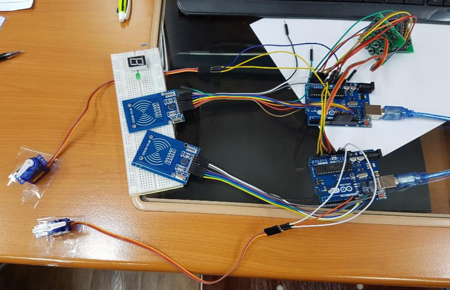 그리고 한쪽 RFID에 카드가 읽히면 두 대의 아두이노에 연결된 서보모터가 동작하도록 하는 것이다.