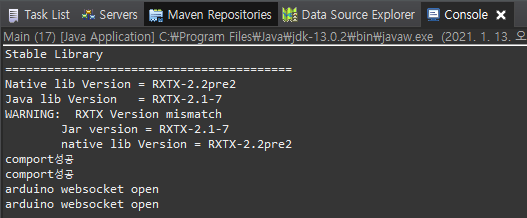더보기package serial; import java.io.InputStream; import java.io.OutputStream; import gnu.io.CommPort; import gnu.io.CommPortIdentifier; import gnu.io.SerialPort; public class Serial { void connect(String port) { CommPort commPort = null; SerialPort serialPort = null; try { CommPortIdentifier com = CommPortIdentifier.getPortIdentifier(port); // com포트를 확인하는 작업 if (com.isCurrentlyOwned()) System.out.println("Error : "+port +"포트를 사용중입니다."); // 포트가 열려있으면 else { commPort = com.open(this.getClass().getName(),1000); // 획득한 포트를 객체가 사용할 수 있는지 여부 확인 if (commPort instanceof SerialPort) // commPort가 SerialPort로 사용할 수 있는지 확인 { serialPort = (SerialPort)commPort; // 정상적으로 포트를 사용할 수 있을 경우 // 포트에 필요한 정보를 입력해 준다. serialPort.setSerialPortParams( 9600, // 바운드레이트 SerialPort.DATABITS_8, SerialPort.STOPBITS_1, SerialPort.PARITY_NONE); // 오류제어 비트 } System.out.println("comport성공"); InputStream in = serialPort.getInputStream(); OutputStream out = serialPort.getOutputStream(); (new Thread(new SerialRead(in, out))).start(); (new Thread(new SerialWebsocket(out))).start(); } } // end try catch(Exception e) {} } }SerialRead.java