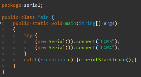 더보기package serial; public class Main { public static void main(String[] args) { try { (new Serial()).connect("COM3"); (new Serial()).connect("COM4"); } catch(Exception e) {e.printStackTrace();} } }Serial.java