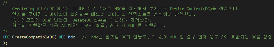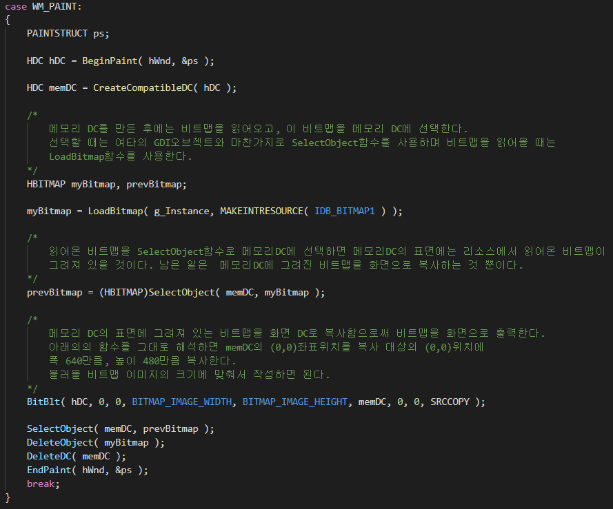 (3). BitBlt함수로 그린다.비트맵을 윈도우 창에 불러오기 위해서는 아래의 세 함수가 필요하다.