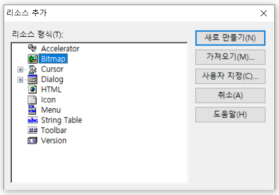 그러면 아래의 리소스 추가 창이 나타나는데, Bitmap을 선택하고 가져오기를 선택한다.
