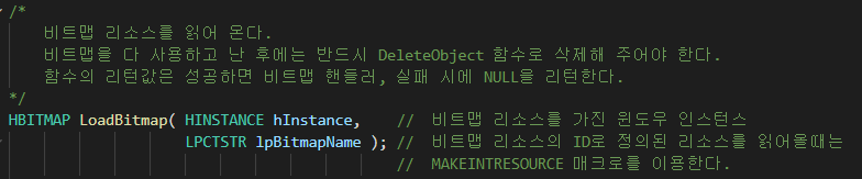 우리가 비트맵 이미지를 불러오기 위해서는 LoadBitmap 함수를 이용해야 하는데,