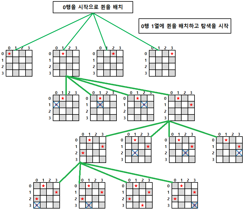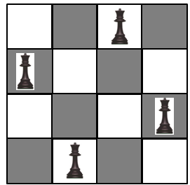 아래의 [그림 1 ~ 4]는 체스판의 크기가 4 X 4일 때의 퀸을 놓는 방법을 나타낸 것이다.