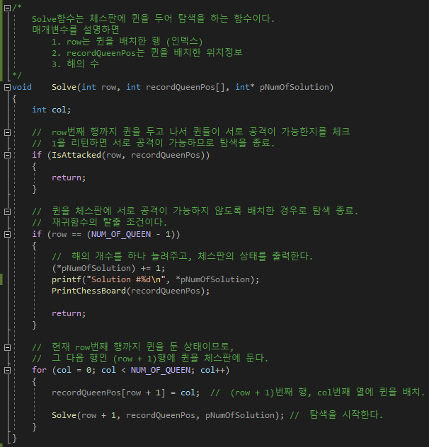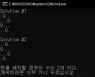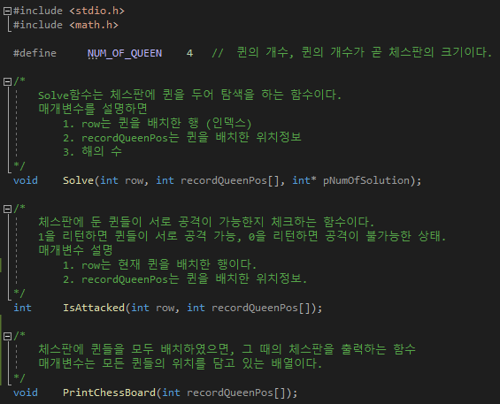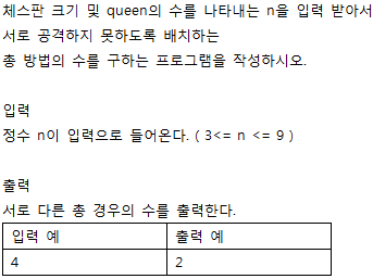 함수는 퀸을 배치하는 함수와 체스판에 배치한 퀸들이 서로 공격이 가능한지 체크하는 함수 이렇게 2개가 필요하다.