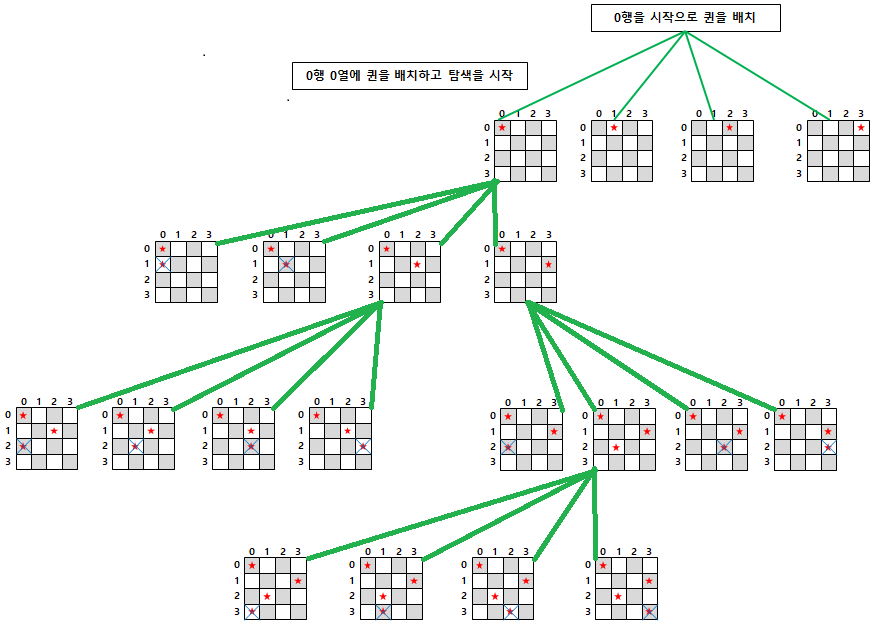 위의 그림에서 보다시피 퀸을 배치하는 일련의 과정들은 재귀함수의 호출을 통해 구현하리라는 것을 알게 된다.