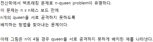4 X 4 이상의 크기라면 이 문제를 적용할 수 있는데, 그래서 8개의 퀸 문제를 N 개의 퀸 문제라 부르기도 한다.